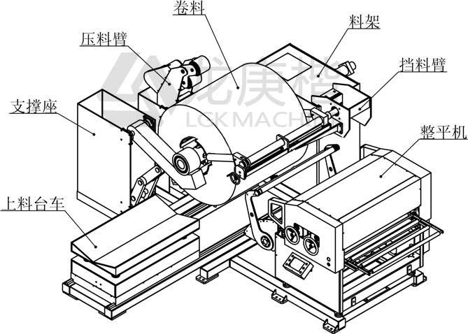三合一送料機(jī)的結(jié)構(gòu)組成:支撐座、壓料臂、料架、擋料臂、整平機(jī)、送料機(jī),選配設(shè)備:上料臺(tái)車